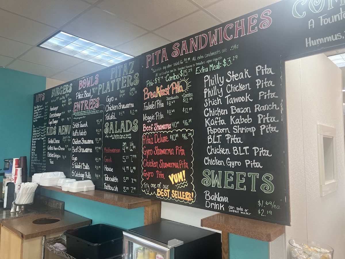 Lettuce, tomatoes, onions, cumbers, Tzatziki sauce, Kalamata olives, feta cheese, and a drizzle of olive oil, wrapped in a pita